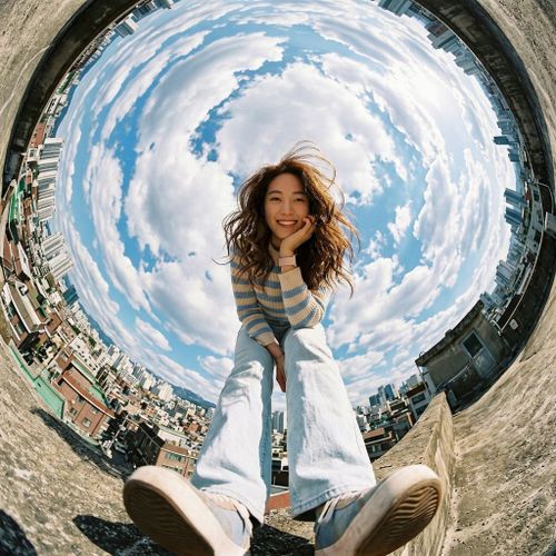 Step into a world seen from the ground up! This extreme fisheye filter creates a playful perspective, emphasizing foreground details like legs and feet, as your surroundings gently curve into a subtle, enchanting 'tiny planet' scene.